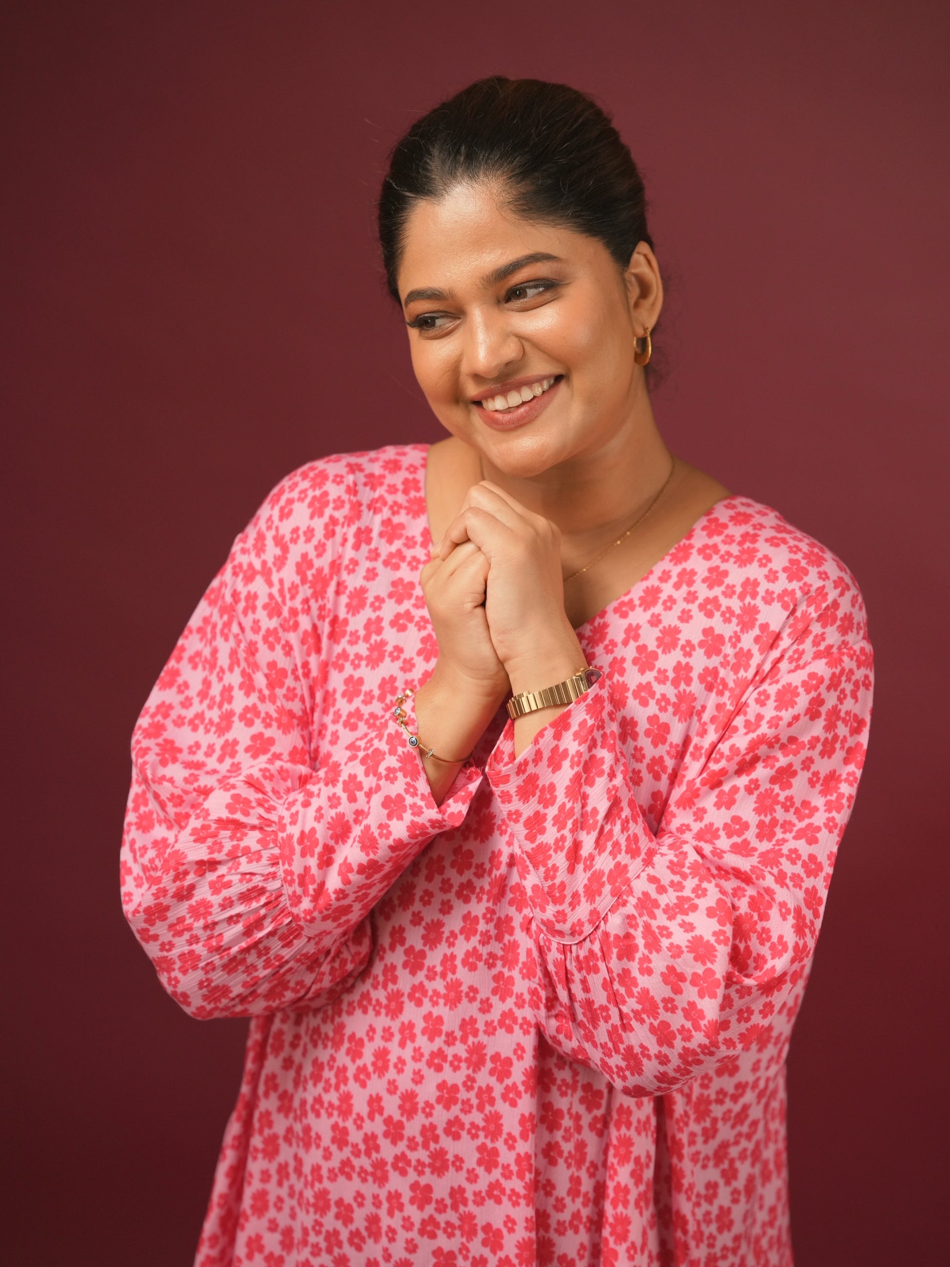 This pink floral oversized dress is designed for ultimate comfort without compromising on style. Featuring a relaxed silhouette and breezy fit, it flatters every body type while giving you that easy, graceful look.